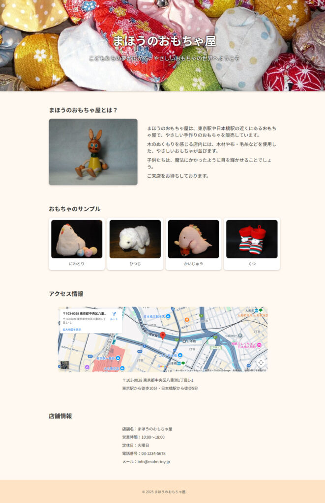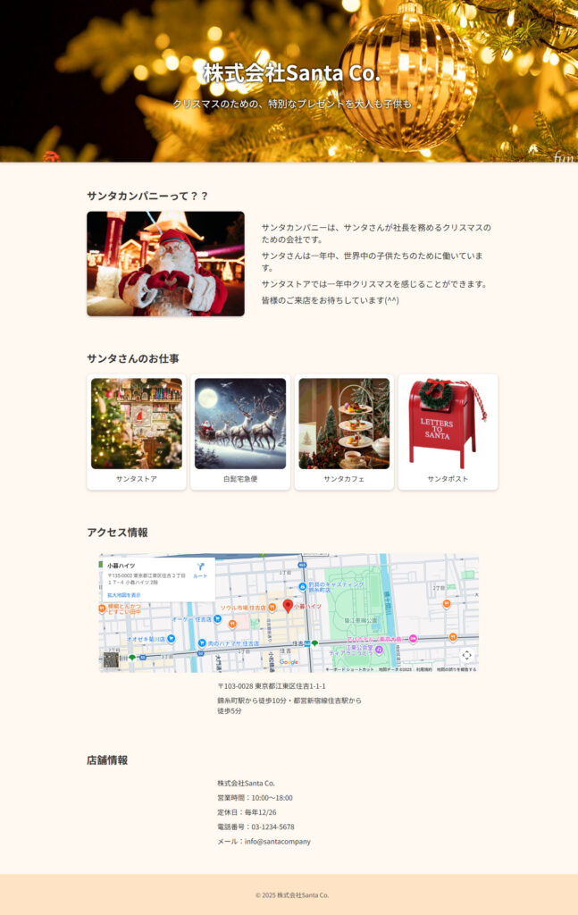 2025/10/22 HTML/CSS実習 訓練記録 2025.10.222025.10.24 コードを書き込んでwebサイトを作成しました!左:まほうのおもちゃ屋 右:株式会社Santa Co.株式会社Santa Co.ページURL↓
