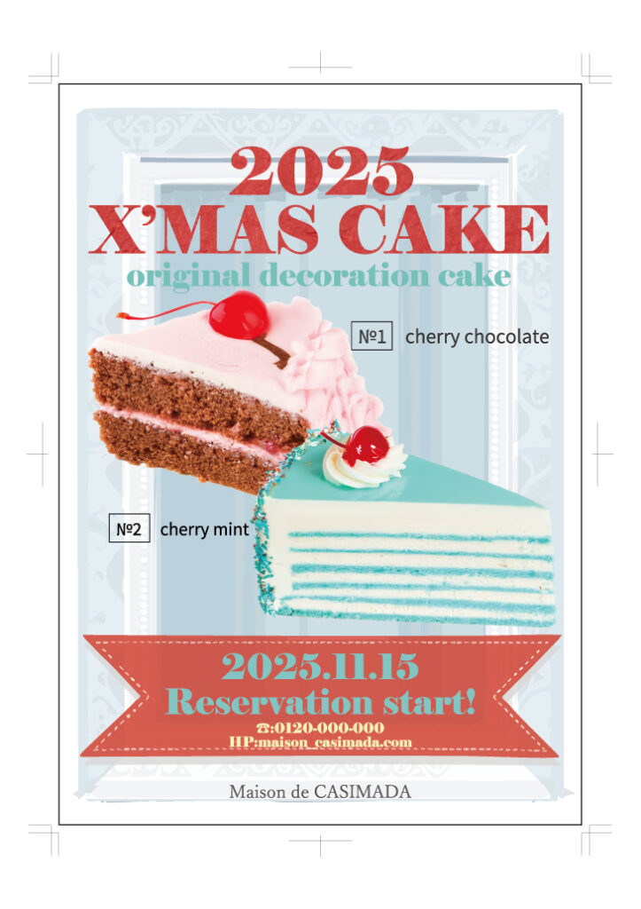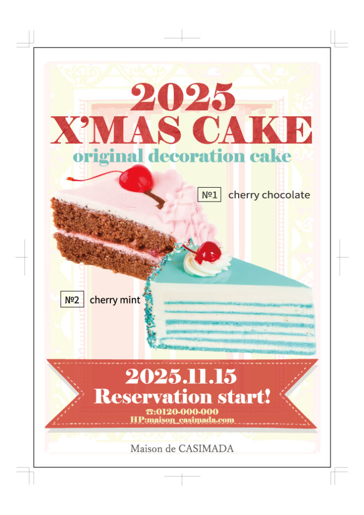 ☆アメリカのカラフルなケーキ屋さんのクリスマスケーキ予約受付開始のフライヤー。背景と、インフォメーションの枠はイラレの生成AI、ケーキ二つもフォトショの生成AIを使って生成。